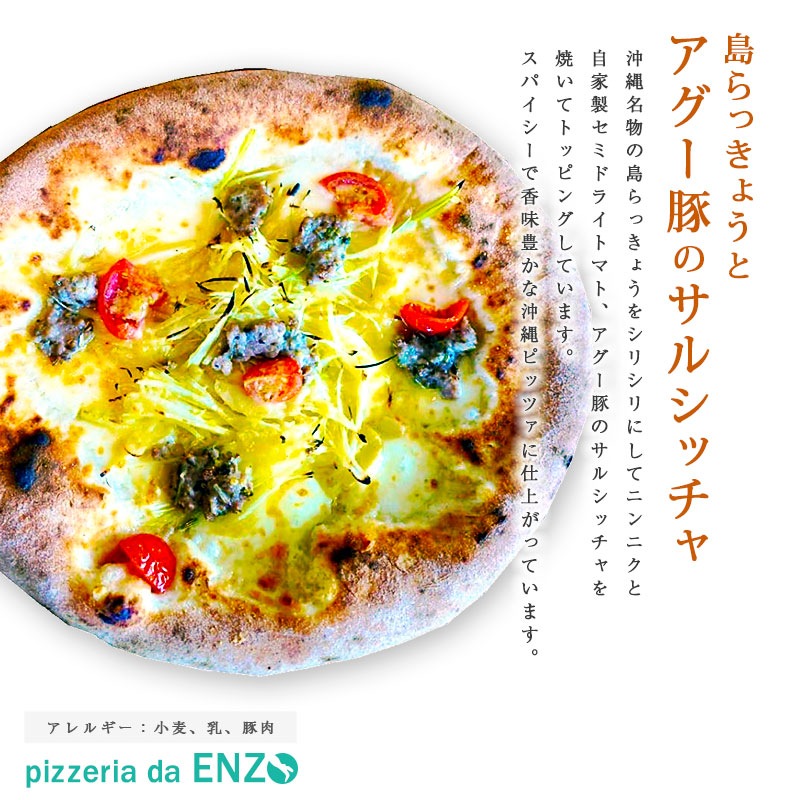 島らっきょうのピザはスパイシーなサルシッチャと島らっきょうの爽やかな香味と相性抜群です。アーサークリームは恩納村の生アーサを使用する事で香が豊で沖縄の海の香りを味わえます。